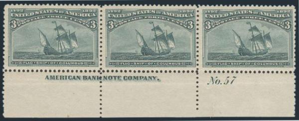 3947 232 image232, Bottom horiz sheet margin strip of 3 with full "AMERICAN BANK NOTE COMPANY" imprint and Plate "No. 57". Fresh colour, F-VF, 2 stamps are NH, slight offset on gum (Image) Estimate 200.00+ $Cdn