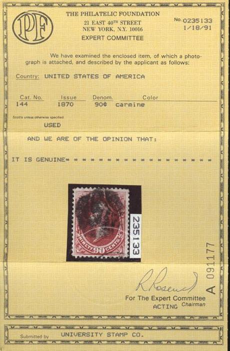 3928 144 image144, Scarce 90¢ Perry with H Grill, beautifully centered, cork cancel. VF. Has 1991 Philatelic Foundation Certificate (Image) (View Certificate)