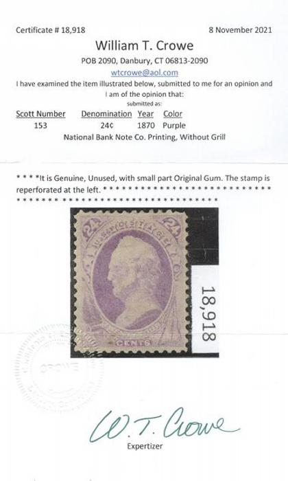3934 153 image153, Fresh mint 24¢ purple Scott. VF, small part OG, reperfed at left. Has 2021 William T. Crowe Certificate (Image) (View Certificate)