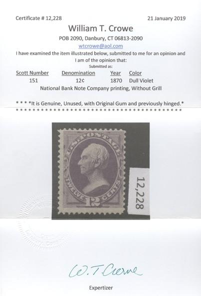 3929 151 image151, Fresh mint 12¢ dull violet Clay. F, OG, VLH (almost looks NH). Has 2019 William T. Crowe Certificate (Image) (View Certificate)