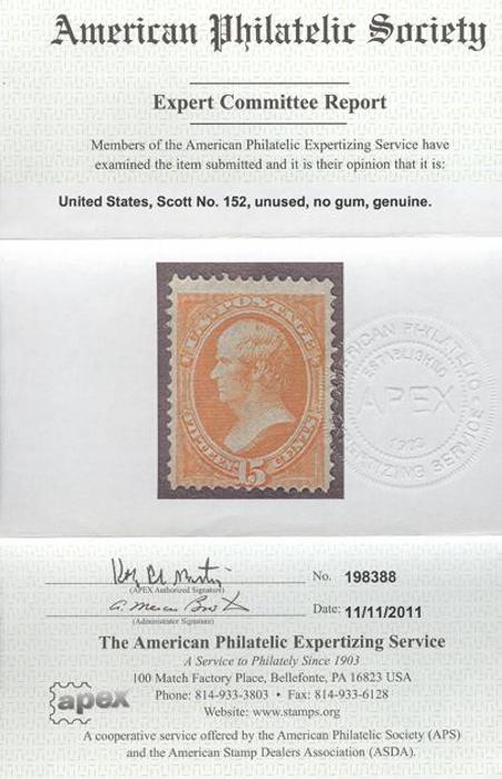 3932 152 image152, Unused 15¢ bright orange Webster without grill. F, NG. Has 2011 APS Certificate (Image) (View Certificate)