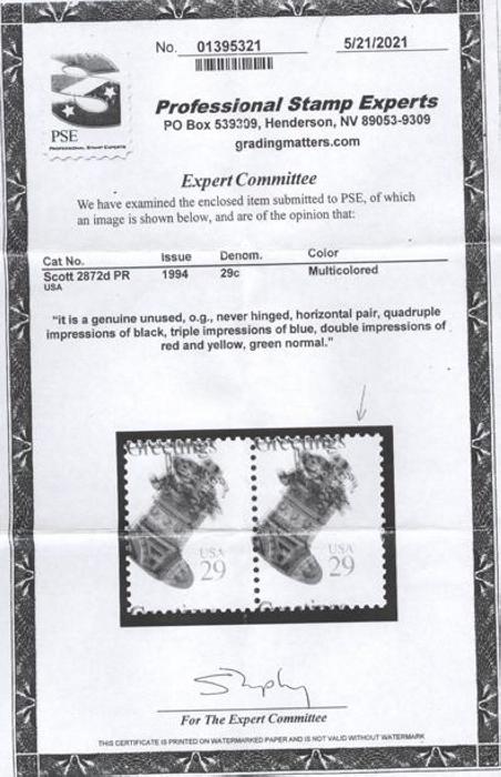 29¢ Greetings stamp with QUADRUPLE black colour, TRIPLE blue colour, DOUBLE red & yellow, and green normal. Fresh, XF, NH. Has photocopy of a 2021 PSE Certificate for a pair of which this is the right stamp. Scarce (Image) (View Certificate)