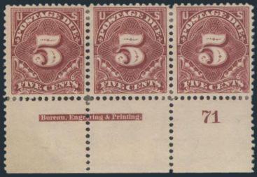 4065 J41 imageJ41, Bottom margin Plate #71 strip of 3, nice centering, rich colour, F-VF, OG, some sensible hinge reinforcement (Image) Cat 450.00