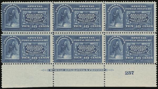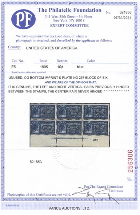 4058 E5 imageE5, Beautiful lower margin imprint and Plate #257 Block of six. Post Office fresh with strong intense colour. F, VLH. Has 2014 Philatelic Foundation Certificate (Image) (View Certificate)