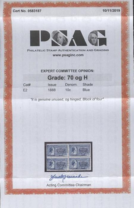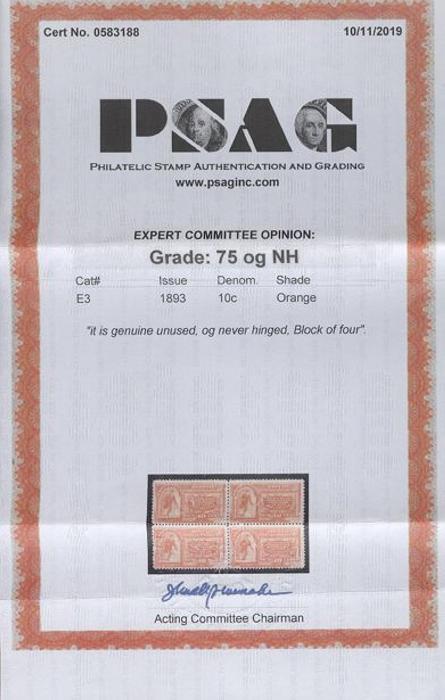 4056 E3 imageE3, Lovely fresh block with rich colour, nice centering, F-VF, lower left stamp is NH. Has 2019 PSAG Certificate Graded 75 (Image) (View Certificate)