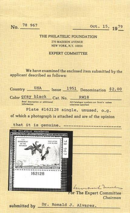 4115 RW18 imageRW18, Plate Number single, VF, VLH. Has 1979 Philatelic Foundation Certificate (Image) (View Certificate)