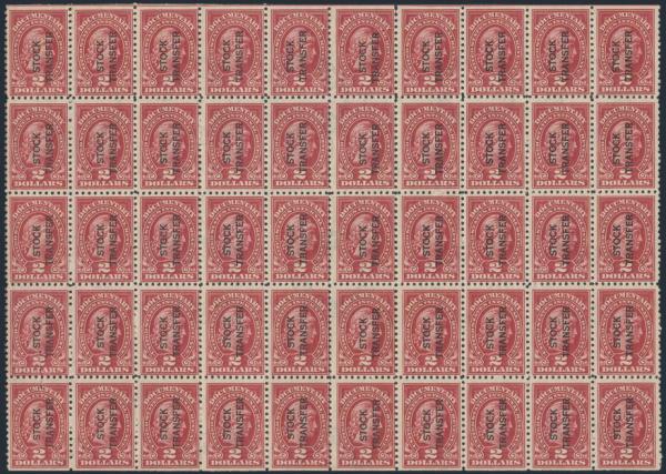 4101 RD31 imageRD31, Rare unused block of 50 of the $2 STOCK TRANSFER overprinted issue. F-VF, NG, 2 stamps small flts, 2 stamps with facial marks. A NICE SHOWPIECE. Scott $3,500 US (Image) Estimate 800.00+ $Cdn