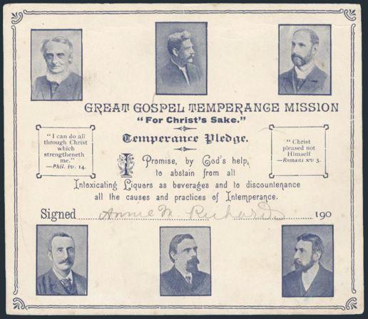 4152   imageGREAT GOSPEL TEMPERANCE MISSION illustrated "Pledge Card" circa 1900's. The signee pledges to abstain from Alcoholic drinks & has religious verses. F, minor edge creases. AN UNUSUAL ITEM FROM THE TEMPERANCE MOVEMENT (Image) Estimate 60.00+ $Cdn