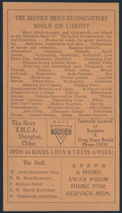 4155   imageYMCA / US NAVY info leaflet (3.5 x 6 in) circa 1930's, from "THE NAVY YMCA SHANGHAI CHINA". Entitled "A HOME AWAY FROM HOME FOR SERVICE MEN". Gives a detailed list of services provided at the YMCA & other info. VF (Image) Estimate 40.00+ $Cdn