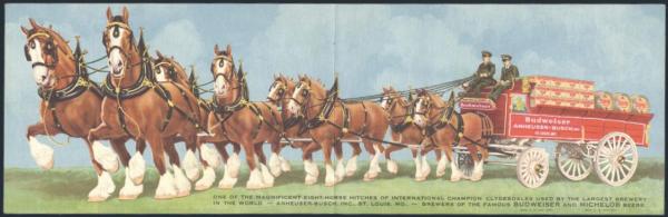 4157   imageUnused multi-coloured postcard circa 1930's with a 2-panel panorama scene depicting the famous ANHEUSER-BUSCH 8-horse team of Clydesdale Horses. VF (Image) Estimate 60.00+ $Cdn