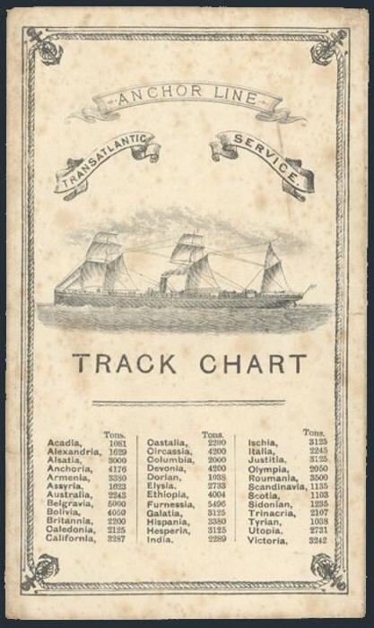 4151   imageInteresting 3-panel folder with a "TRACK CHART" circa 1880's for the sailing of the Anchor Line ship "Furnessia" from New York to Glasgow Scotland. Has picture of a Steamship on outside cover, list of the Anchor Line ships (the Furnessia was the largest at 5,496 tons), map of the Trans-Atlantic route, other details, etc. F, some age spotting (Image) Estimate 75.00+ $Cdn