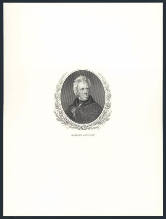 4154   imageEngraved b/w print on card (6 x 8 inches) of PRESIDENT ANDREW JACKSON surrounded by a fancy wreath. This is the portrait that appears on an American $20 Bill since 1929. VF (Image) Estimate 100.00+ $Cdn
