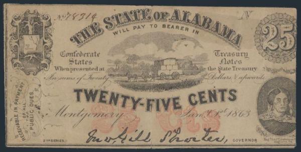 4185   imageState of Alabama 25¢ Fractional Currency banknote dated 1 Jan, 1863, depicting a Cotton Wagon. VG-F, minor flaws (Image) Estimate 50.00+ $Cdn