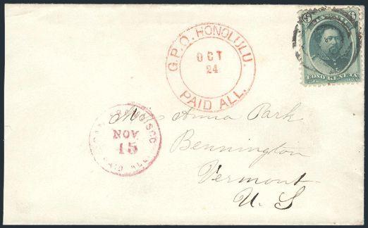 4194 33 image33, Tied by target cancel on a beautiful cover addr to Vermont. Has red GPO Honolulu Paid All marking & violet San Francisco transit. VF, slightly reduced at left (Image) Estimate 350.00+ $Cdn