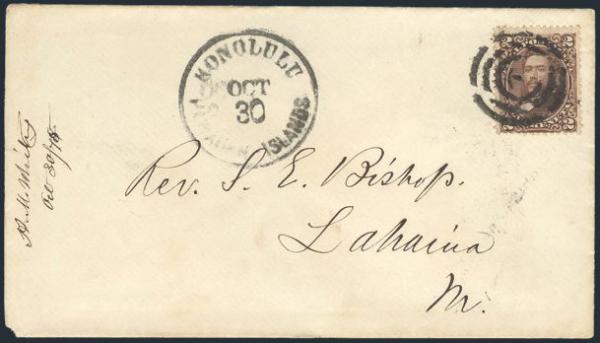 4196 35 image35, Tied by target cancel on 1875 cover with Honolulu / Hawaiian Islands Oct 30 postmark addr to Lahaina, Maui. F-VF. An attractive cover! (Image) Estimate 200.00+ $Cdn