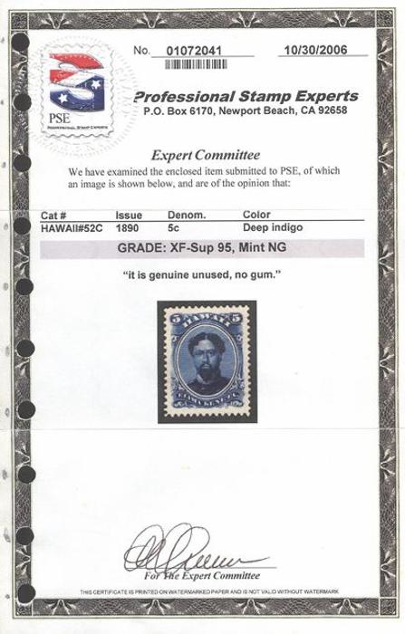 4197 52C image52C, Striking unused 5¢ deep indigo King Kamehameha V incredibly well centered within four huge margins. XF, NG. Has 2006 PSE Certificate graded "XF-Sup 95" (Image) (View Certificate)