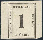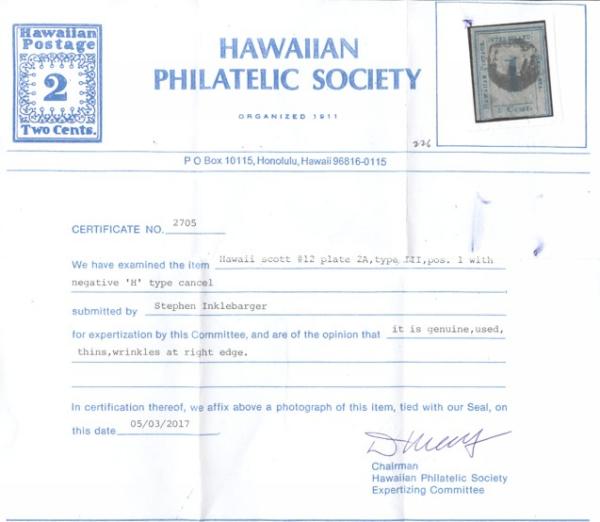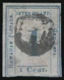 4188 12 image12, Rare 1¢ light blue Numeral on bluish white paper (Plate 2A, Type III, Pos 1). F-VF, three close to large margins, negative "H" type cancel, thins, wrinkles at right edge. Has 2017 Hawaiian Philatelic Society Certificate. A SELDOM OFFERED STAMP (Image) (View Certificate)