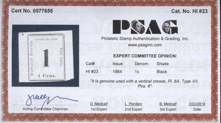 4190 23 image23, Used 1¢ black Numeral on laid paper (Plate 8A, Type VII, Pos 8). VF appearance with two ENORMOUS margins, light pen cancel, vertical crease. Has 2018 PSAG Certificate (Image) (View Certificate)