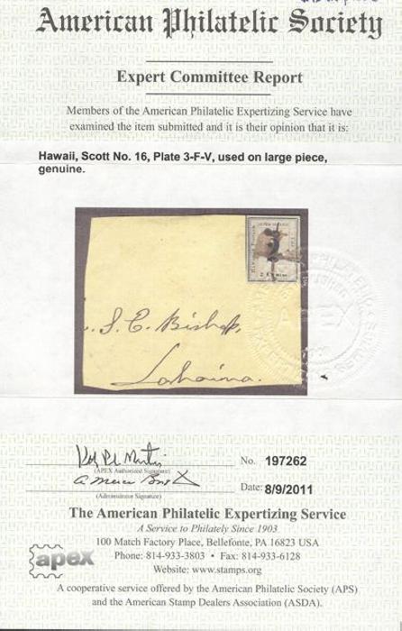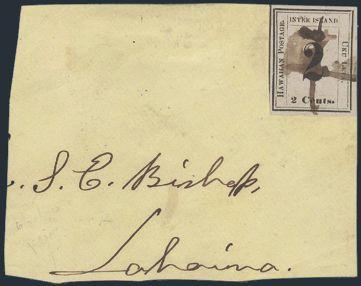 4189 16 image16, VF four margin example of Plate 3-F-V (showing a portion of the adjoining stamp at left, illustrating how tight the margins are between the stamps), manuscript cancel tied on piece, addr to Lahaina. VF. Has 2011 APS Certificate (Image) (View Certificate)