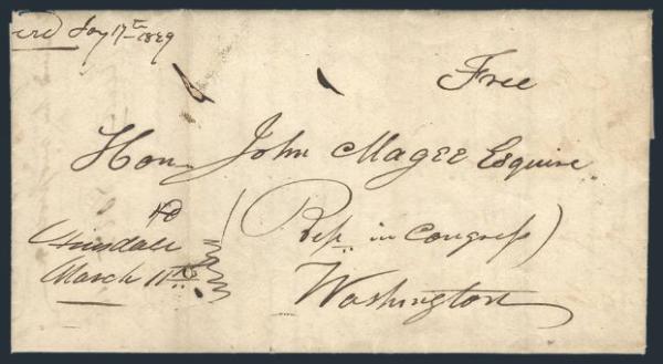 free-franked folded letter datelined Cuba 5 Mar 1828. From DANIEL RAYMOND Political Economist to Hon. JOHN MAGEE, Republican in Congress, Washington (Magee fought in the War of 1812). Interesting contents incl Anti-Masonic comment & mentions