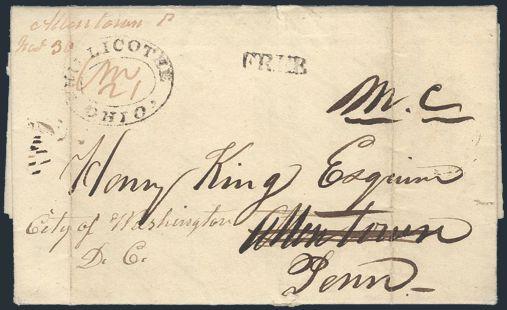1832 F/L of congratulations from Democrat Peter Douglas of Ohio to Democrat Henry King of Penn on his being elected to Congress. Has oval 2-ring Chillicothe, O 21 Nov cancel & "FREE" h/s. Sent to Allentown, Penn; redirected to Washington, DC. Quotes