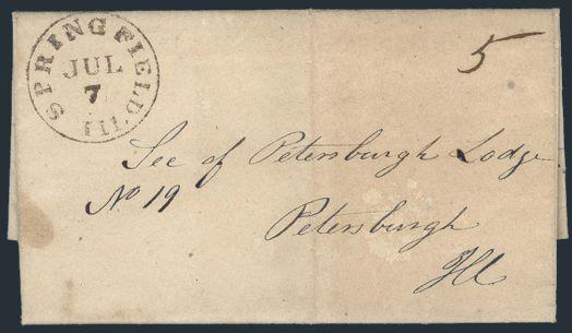 1845 F/L which is MASONIC & ANDREW JACKSON related sent from Springfield, Ill 7 July CDS. From Springfield Lodge #4 to Petersburgh Lodge #19, in Petersburgh, Ill. Has "5" m/s rate. Invitation to commemorate the death of Brother/President "ANDREW