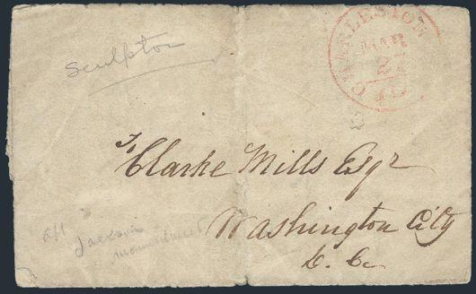 1848 F/L with red Charleston, SC 27 Mar CDS addr to famous sculptor CLARKE MILLS, Washington City, CD. Sculpted the statue depicting President ANDREW JACKSON on horseback. Writer requests details as to arrangements made with the committee responsible