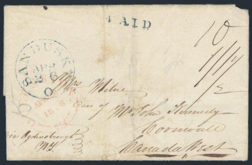 cross border 1848 TURNED COVER, originally carried by favour to Sandusky, Ohio. Then remailed with blue Sandusky Ohio 2 Ap CDS to Cornwall Canada West. Has Queenston UC exchange office CDS, Kingston transit, etc. Has 2 diff m/s rates & blue 'PAID'