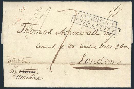 1817 Trans-Atlantic folded letter per the ship "Heroine" from Boston, addr to THOMAS ASPINWALL, US CONSUL IN LONDON. Has 3 diff m/s rates & stepped boxed "LIVERPOOL SHIP LETTER" handstamp. Thomas Aspinwall was a hero in the War of 1812. He was