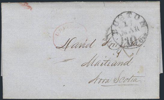 cross border folded commercial letter datelined New York 15 Mar, 1856 to Maitland, Nova Scotia. Has numerous markings incl "6" rate, Boston date stamp, red oval UNITED STATES, transit b/s's from St John NB, Annapolis & Newport. VF (Image)