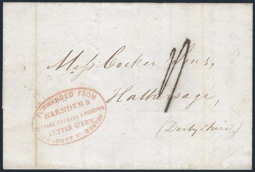 folded Trans-Atlantic cover from Boston date-lined 1 Nov 1843 to England. Has nice red oval HARNDEN'S LETTER OFFICE in Boston forwarder's h/s. On reverse has VF double oval "AMERICA / L". F. Ex Jack Arnell (Image)