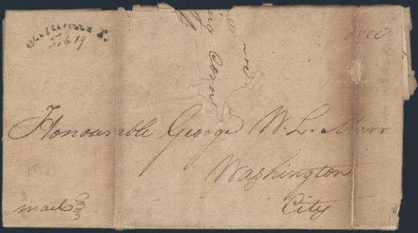 stampless 1818 folded free franked official letter with Clarksville, T. (Tennessee) 19 Feb arc type cancel (m/s date) to Washington, DC. to George W.L. Marr (famous politician) from J. Baxter, quartermaster, Lookout Mountain Camp, Cherokee Nation