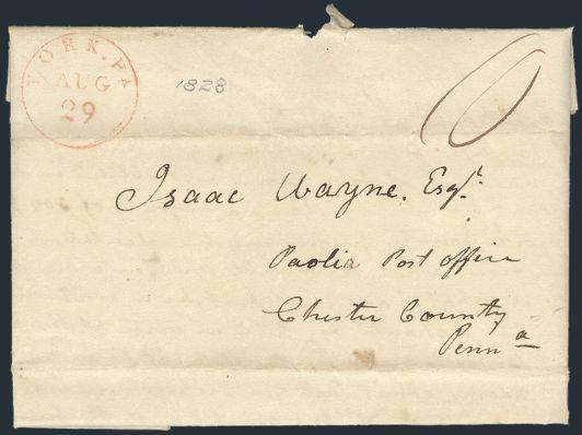 stampless folded letter 1828 with red York, Pa 29 Apr CDS & "10" m/s rate, addr to ISAAC WAYNE, Paoli, Penn (served in Penn. House of Representatives & Senate). Writer asks his opinion on the possibility of ADAMS, JACKSON or BUCHANAN being elected in