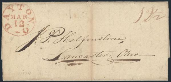 1829 folded cover with crisp red Dayton, O 12 Mar CDS to Lancaster, Ohio Testimonial re the recommendation of a J.P. Helfenstine to President ANDREW JACKSON with 10 diff signatures. F, touch of separation. Interesting historical cover (Image)