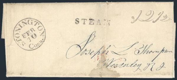 folded ship letter pre 1840 from New York to Westerley R.I. Has "STEAM" h/s and Stonington Conn CDS, rated 12.5. VG+, file fold, small stain (Image)