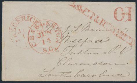 cover circa 1840's from Fredericksburg Va to Clarendon SC. Has red s/l "MISSENT & FORWARDED" along with Charleston SC CDS cancel. Originally rated '5' and then '10' overtop. VF