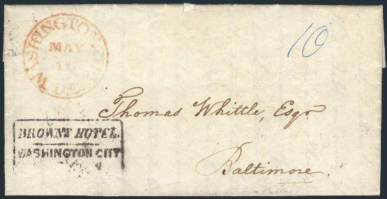 folded letter with red Washington City / DC 16 May 1842 CDS to Baltimore. Has blue "10" m/s rate & black boxed "BROWN'S HOTEL / WASHINGTON CITY" h/s. F (Image)