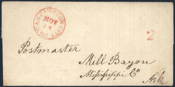 1845 folded printed document with red Washington City / DC 16 Nov CDS & "2" hammer rate to Postmaster, Mill Bayou, Ark. From the committee raising funds for the erection of the memorial statue for PRESIDENT ANDREW JACKSON. Has matching embossed seal
