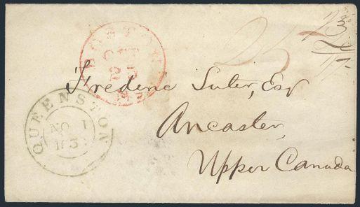 printed 1838 folded cross border cover from EAST BOSTON COMPANY in Boston Mass, addr to ANCASTER, UPPER CANADA. Has Queenston UC entry cancel. Rated 25¢ (US Postage) plus 4½d from border to Ancaster total 1Sh 7.5d collect. F (Image)