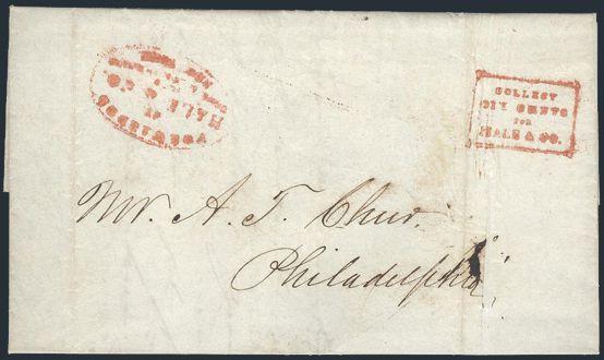 stampless folded letters from New York, Sept/Oct 1844 to Philadelphia & Providence R.I. respectively. Each has red boxed "COLLECT / SIX CENTS / FOR / HALE & Co.". Private Dispatch / Forwarding Agent h/s's. First has additional red oval "FORWARDED /