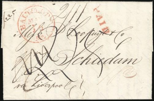 folded Trans-Atlantic letter with red Baltimore 10 May 1837 CDS to Holland. Has Liverpool & London 12-3 June transits, red "PAID" & 2-line England / Rotterdam h/s's, variety of m/s rates & red Schiedam 16 June receiver. Interesting contents regarding