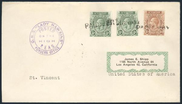 WEST INDIES "LADY HAWKINS" SHIP COVERS: Attractive collection of 8 covers & 1 postcard carried aboard Cdn Ntl Steamship C.N.S. LADY HAWKINS, from 1935-41. Have frankings from 10 diff West Indies Islands; plus Bermuda & Br. Guiana. Addr