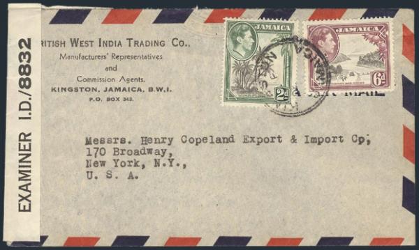 JAMAICA WWII CENSORED COVERS TO USA: Interesting accumulation of WWII Censored Airmail covers to USA most in sleeves. Franked by KGVI issues; variety of Censor Examiner number tapes. Incl many corner cards. A good lot