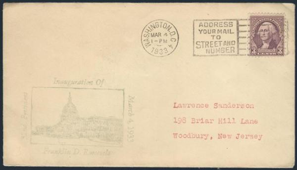 by Washington, DC 4 Mar 1933 slogan cancel on green cach INAUGURATION of PRESIDENT F.D. ROOSEVELT cover to Woodbury, NJ. Depicts Capital Hill. F (Image)