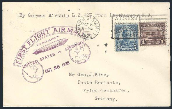 Tied on cach GRAF ZEPPELIN Oct/Nov 1928 America Flight cover, Lakehurst to Friedrichshafen leg. VF (Image)