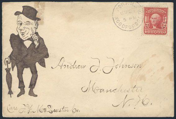 by Portland Me duplex on 1904 cover to Manchester NH (rec b/s). Has HAND DRAWN ARTWORK of a winking man. F. Some soiling (Image)