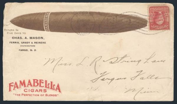 by Fargo, ND 7 Apr 1908 cancel on colour illustrated advertising cover for C.A. Mason distributor & Famabella Cigars to Fergus Falls, Minn. Depicts cigar. F, small stamp & cover flaws (Image)