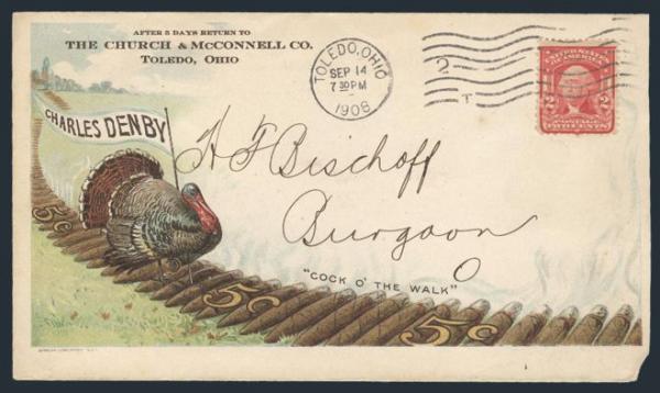 by Toledo, Ohio 14 Sept 1908 cancel on multi-colour illustrated advertising cover for The Church & McConnel Co. in Toledo. Addr to Burgoon, Ohio (15 Sept b/s). Depicts Turkey on Pathway of Cigars "COCK O' THE WALK". F, slightly reduced (Image)