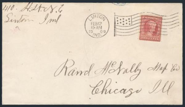 Lincoln 2¢ neatly tied by Linton, Ohio 12 Feb, 1909 Flag cancel on FDC (front only). F, centre crease not affecting the stamp. Cat $500 US (Image)
