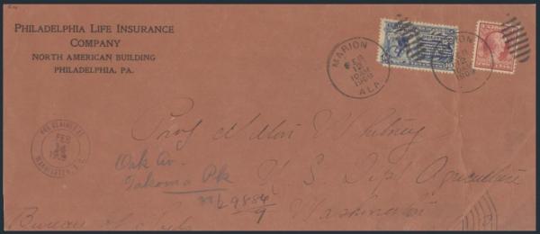 with E6 (rounded corner), Tied by Marion Ala 12 Feb, 1909 on #10 size Special Delivery (front only) to Washington DC. This is a FIRST DAY COVER FOR #367 which Cat $500 US. F
